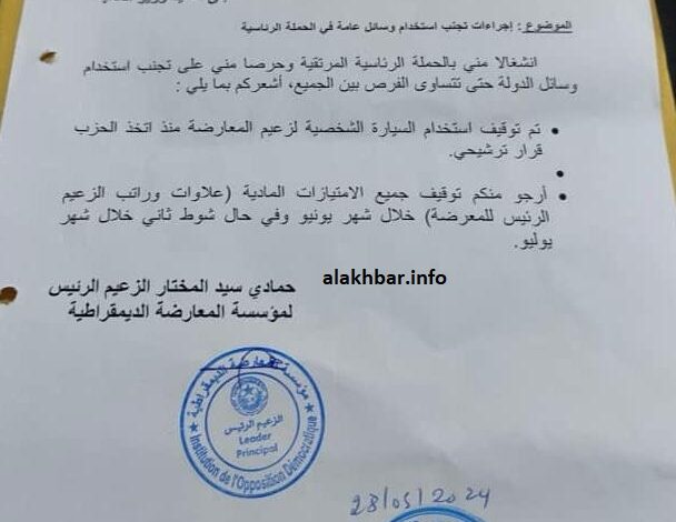 أبلغ الزعيم الرئيس للمعارضة، ومرشح حزب التجمع الوطني للإصلاح والتنمية “تواصل” حمادي سيدي المختار وزير المالية إسلم ولد محمد امبادي بوقف سيارته الحكومية منذ إعلان الحزب ترشيحه للرئاسيات المقررة يوم 29 يونيو المقبل، وطالبه بوقف امتيازاته خلال الحملة الانتخابية.